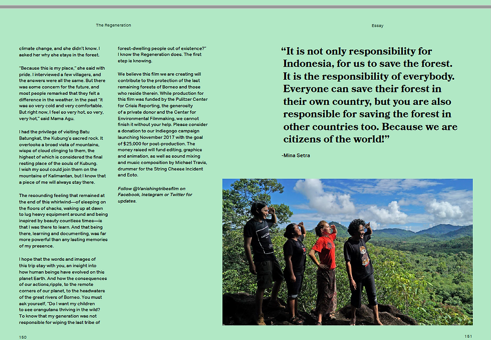 We believe this lm we are creating will contribute to the protection of the last remaining forests of Borneo and those who reside therein. While production for this lm was funded by the Pulitzer Center for Crisis Reporting, the generosity